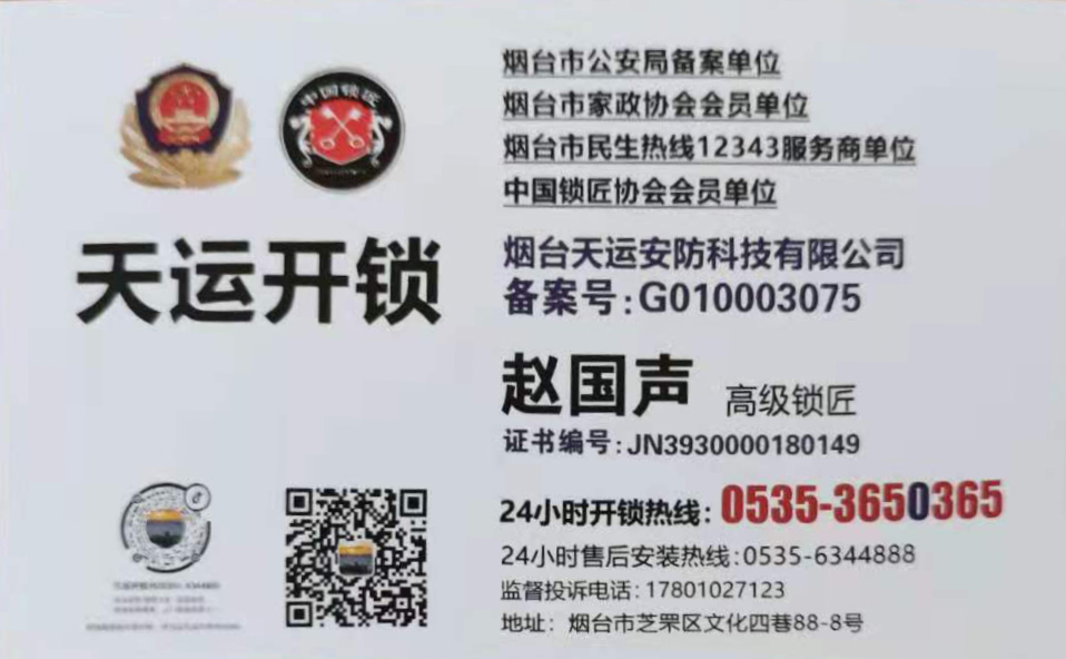 天运365开锁是烟台天运安防科技有限公司旗下推出的一个自2016年开始的开锁、换锁、智能锁销售安装、门禁卡复制、汽车遥控等锁具修理项目。该项目正规备案,本着勤勉、至臻、博爱的经营理念24小时全天候服务于烟台百姓。自推出以来,热心公益事业,推出孤寡老人免费开锁,社区居民换锁七折。先后在相关部门号召下在新海阳、芝罘岛中里、塔山、奇南、朱家庄、世回尧等社区举办免费锁具修理活动。